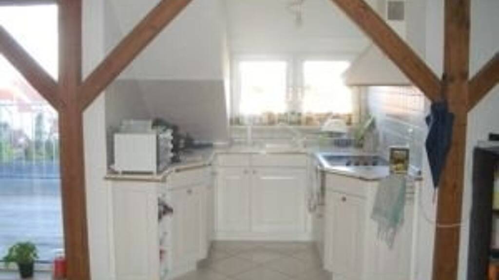 Objektbeschreibung Sie betreten Ihre neue Wohnung im 1.Dachgeschoss und erreichen über die in der Wohnung liegende Treppe die zweite DG-Ebene zum Wohnen * ein zentraler Raum bietet unter Dachschrägen und Sichtbalken ausreichend Platz zum Wohnen, Schlafen und Arbeiten * viel Licht spenden die bodentiefen Fenster und die verglasten Gauben im offen angrenzenden Küchenbereich (schöne Einbauküche vorhanden) und dem separaten Tageslichtbad mit Dusche und Platz für Ihre Waschmaschine * Highlight ist die große Dachterrasse zum Sonnen und Entspannen * besonderer Schick -das originale Ochsenauge- eine Fensterform mit individuellem Charakter. * Laminatböden * Bezug ab Juli 2026 * Haustierhaltung ist nicht erwünscht Raumaufteilung kombinierter Wohn-/Schlafraum, offene Küche mit EBK, Tageslichtbad, Treppenaufgang innerhalb der Wohnung, Keller, Dachterrasse