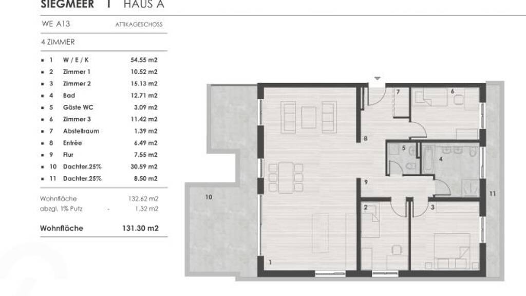 Die Quadratmeterangabe bei der Terrassen-/Balkonfläche bezieht sich auf die tatsächliche Größe. Die Terrassen und Balkone sind zu 50% in die Wohnfläche angerechnet. Die Dachterrassen sind zu 25% in die Wohnfläche angerechnet.