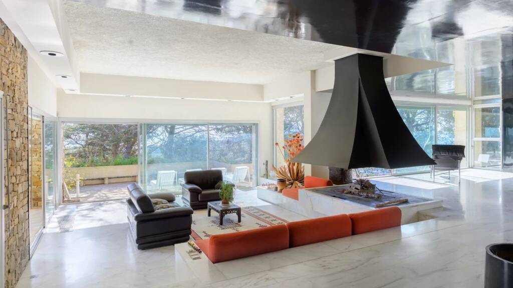 Upon entering, a grand entrance hall leads into a luminous double living room, centered around a striking architectural fireplace, a defining feature of the home. Expansive picture windows frame the lush surroundings and create a seamless connection to the outdoor terraces.