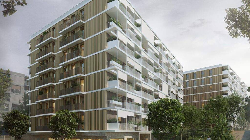 Großzügig und freundlich gestaltete Entrées empfangen die Bewohner:innen und leiten in geräumige Stiegenhäuser. Einschnitte in den obersten Geschossen und weite Treppenaugen bringen Tageslicht tief in die Allgemeinbereiche. Einen wichtigen Beitrag zum sommerlichen Hitzeschutz leisten begrünte Freiraumzonen vor den Wohnungen sowie der textile Sonnenschutz an den Balkonfronten. Auf den Gründächern entsteht mit einem Biodiversitätskonzept neuer Lebensraum für Vögel und Insekten.