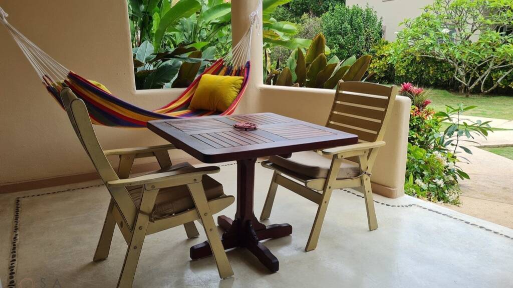- Großzügiger Wohnbereich mit Glasfenstern - Deckenventilatoren und Klimaanlage für optimales Wohlbefinden - Moskitonetze für entspannte Abende - Sicherheitsaspekt durch Schließfach - Beschattete Terrasse mit Blick auf den malerischen Garten und den Pool