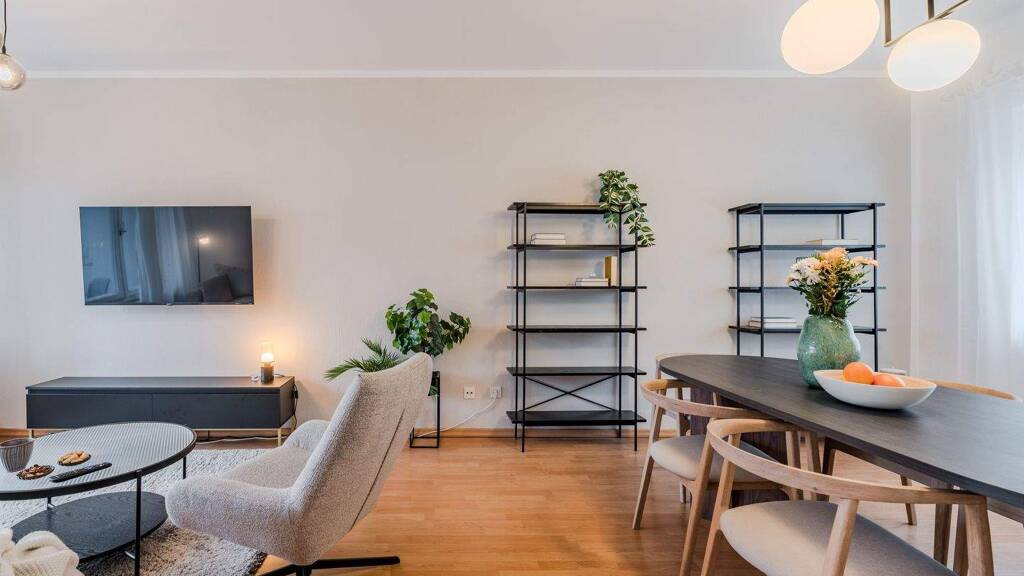 This newly designed 3-room apartment offers a contemporary and comfortable home on 73 m². The apartment is ideal for couples, small families, or commuters who appreciate first-class transport connections. The spacious living room with a large corner couch, 4K TV, and a large dining table forms the center of social life. From here, you enter the sunny balcony. Two full-sized bedrooms with double beds and large wardrobes provide ample storage space and privacy.