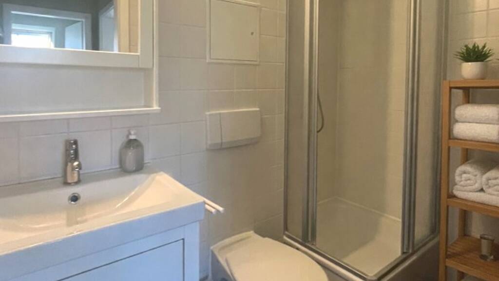 Das Badezimmer ist gefliest und mit einer Dusche ausgestattet.