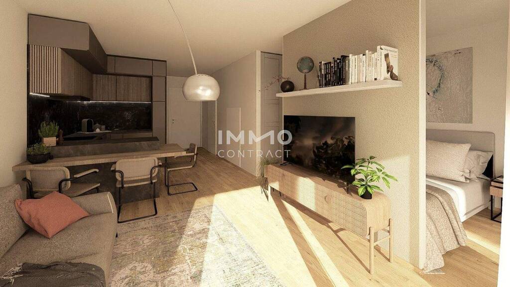 Raumaufteilung: Abstellraum, Bad/WC, Wohnküche (Küche nicht möbliert) mit abgetrennten Schlafbereich, Terrasse/Loggia. Jeder Wohnung ist ein eigenes Kellerabteil zugeordnet.