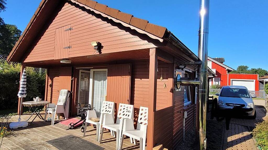 Holzhaus: Baujahr: 1993 Wohnfläche: ca. 38 m² Grundstück: 262 m² Räume: Wohn-/Essbereich mit Küche, Schlafzimmer, Bad, zusätzlicher Bereich unter der kleine Dachschräge Kaminofenheizung Aktuell vermietet (385 € mtl.)