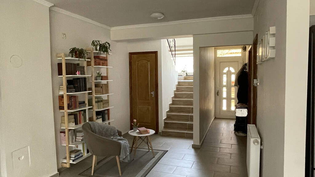 Im Inneren der Immobilie befindet sich im Erdgeschoss ein geräumiges und helles Wohnzimmer mit offener Küche, ein Badezimmer und ein Arbeitszimmer. Im Obergeschoss gibt es drei Zimmer, von denen eines einen Balkon hat, einen Vorraum und ein geräumiges Badezimmer mit Badewanne.