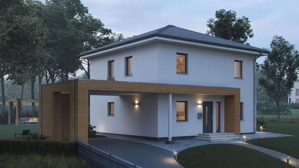 Dieses Traumhaus bietet mit seinem formschönen Walmdach besondere Mehrwertzonen wie den linearen Treppenaufgang oder das großzügige Elternschlafzimmer samt Wohlfühlbad. Aus dem offenen Wohn-, Ess- und Küchenbereich führen Stufen direkt hinaus in den Garten. Serienmäßig höhere Wände sorgen für ein atmosphärisch überzeugendes Raumgefühl. Mit diesem stimmigen Wohnkonzept gelingt so im Inneren der Stadtvilla eine kreative Raumnutzung.