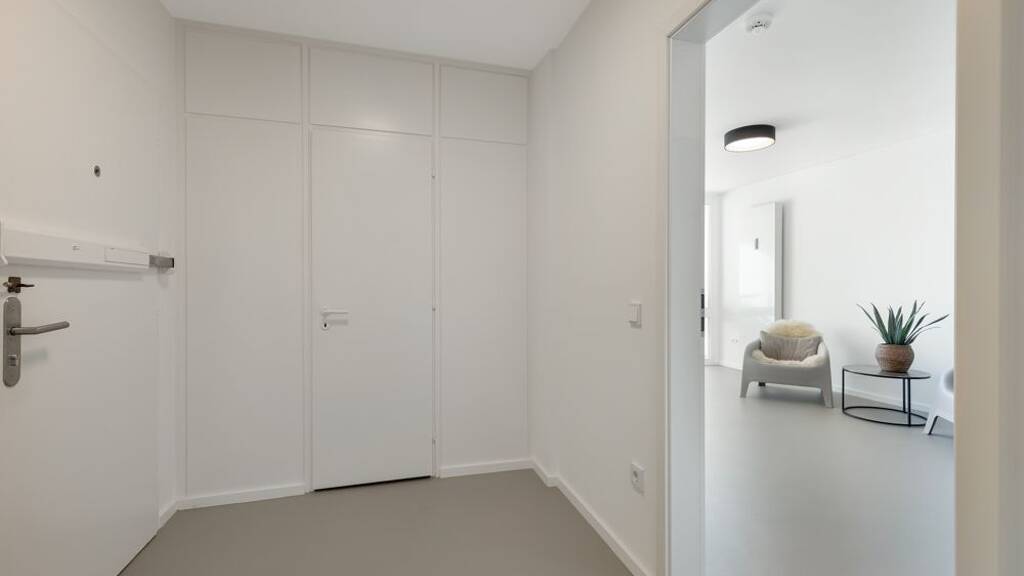 Beim Betreten der Wohnung empfängt Sie ein einladender Flur, der Zugang zum Badezimmer, zum Wohnbereich sowie zu einer praktischen Abstellkammer bietet. Die Wohnung ist mit einem hellen Design-Linoleum von Gerflor ausgestattet, der für ein freundliches und großzügiges Raumgefühl sorgt. Im Wohnbereich befindet sich eine offen gestaltete Küchenzeile mit Ceranfeld, Spülmaschine und Backofen. Auch das Anschließen einer Waschmaschine wäre mit geringfügigen Umbauten möglich.