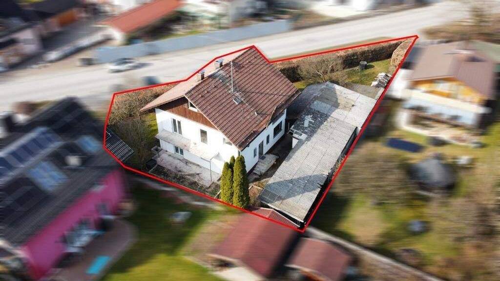 Auf dem unten abgebildeten Lageplan ersehen Sie den Umriss des derzeitigen Bestandsgebäudes (rot) sowie Garagen und Schuppen (grau) .