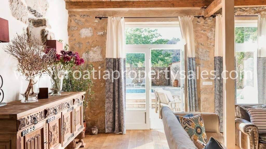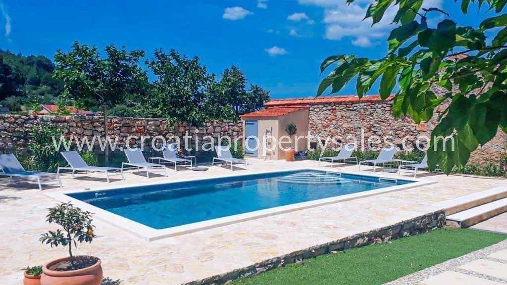 Ein einzigartiges Anwesen mit großem Garten und Swimmingpool, ein Komplex aus renovierten Steinhäusern, Alleinstehend in ruhiger Lage. Das Haus hat drei Etagen, es ist innen und außen über Treppen miteinander verbunden. Im Inneren sind es Holztreppen. Im Erdgeschoss gibt es ein großes Wohnzimmer mit Kamin (Holzofen) und Ausgang zum Pool/Garten, WC, Schlafzimmer, Badezimmer (Dusche/Lavendel), ein zusätzlicher Raum dient als Chill-Bereich mit Ausgang zum Garten /Pool. Auf der mittleren Etage gibt es einen offenen Raum, Küche, Esszimmer: Zugang zur Sommerküche, Garten. WC, einem Ausgang zur Terrasse, zwei Schlafzimmer und Badezimmer (Dusche/WC) im Flur. Eine Holztreppe führt zum Dach, wo sich ein großes Schlafzimmer und ein Badezimmer (Dusche/WC) befinden. Das Anwesen ist von mediterranen Pflanzen und Bäumen umgeben. Parkplatz vorhanden.