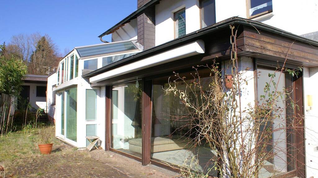 Das freistehende Einfamilienhaus mit Einliegerwohnung wurde 1960 in zweigeschossiger Massivbauweise mit Vollkeller errichtet. Satteldach mit Ziegeleindeckung; Erweiterung durch einen Anbau in eingeschossiger Massivbauweise erfolgte 1978; im Erdgeschoss befinden sich 3 Schlafzimmer, Wohnzimmer mit offenem Kamin und Ausgang auf die Terrasse, Esszimmer mit Besprechungszimmer, Küche, Esszimmer mit Wintergarten, Bad / WC mit Wanne und Dusche, Diele mit Gäste-WC. Im Obergeschoss befinden sich ebenfalls 3 Schlafzimmer, Wohnzimmer mit Ausgang auf die Dachterrasse und Loggia, Bad mit Dusche, Diele mit separatem WC, Bad / WC mit Wanne.