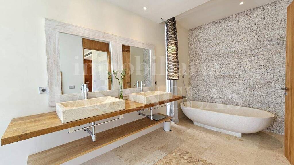 Diese exquisite, minimalistische Designer-Villa befindet sich auf einem weitläufigen Grundstück, das absolute Privatsphäre garantiert und einen atemberaubenden Blick auf das glitzernde Meer sowie spektakuläre Sonnenuntergänge bietet. Die malerischen Strände der Westküste und das charmante Dorf San José sind nur eine kurze Autofahrt entfernt.