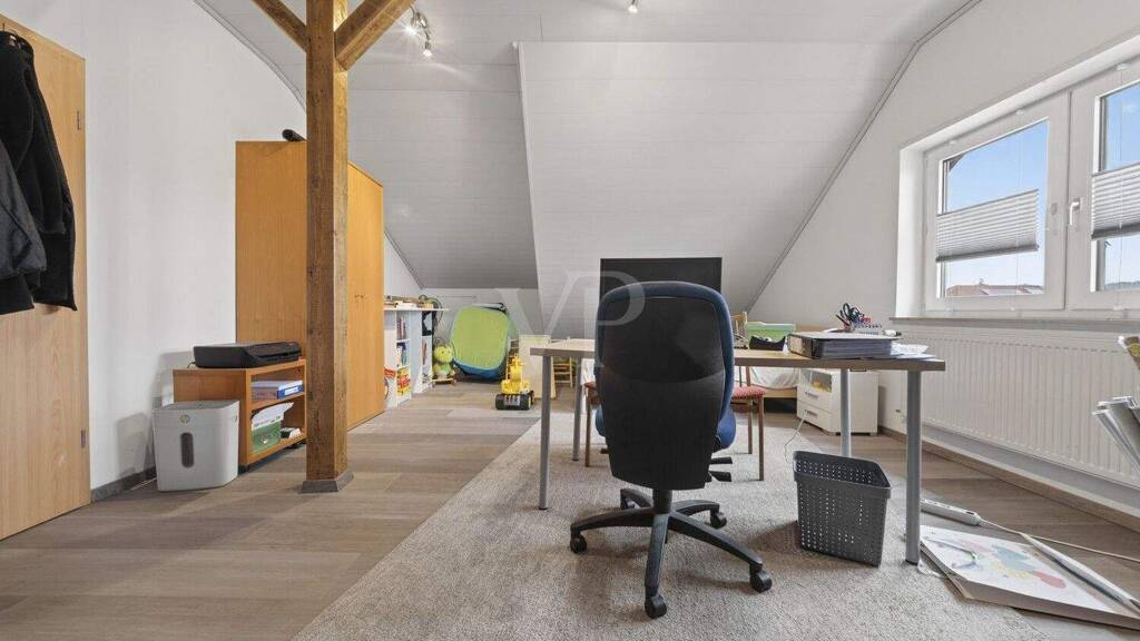 Neben dem Wohnzimmer befindet sich die Küche. Darüber hinaus stehen Ihnen auf dieser Ebene ein Büro, ein Kinderzimmer, ein Badezimmer, ein separates Gäste-WC sowie ein praktischer Abstellraum zur Verfügung.