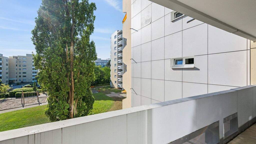 Vom angenehm hellen und großzügigen Wohn-Essbereich betreten Sie den Balkon im Westen. Das Schlafzimmer und das Kinderzimmer sind nach Osten orientiert, die Küche nach Norden. Das deckenhoch geflieste, innenliegende Badezimmer mit Wanne, Waschbecken und Anschluss für die Waschmaschine sowie das separate WC sind im 70er Jahre Design. Auch bei der Einbauküche denken Sie sicherlich über eine Modernisierung nach.