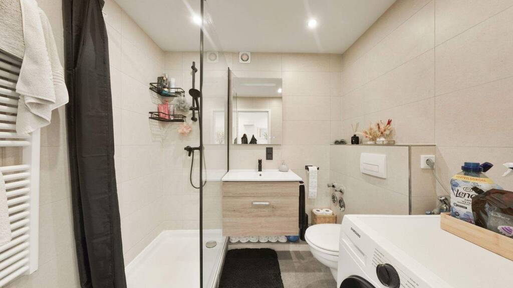Der großzügige Wohnbereich öffnet sich zur modernen Küche und schafft ein kommunikatives Herzstück der Wohnung. Klare Linien, hochwertige Oberflächen und viel Licht sorgen für ein elegantes Raumgefühl. Das geschmackvoll gestaltete Bad ist mit einer bodengleichen Dusche ausgestattet. Warme Materialien und durchdachte Details verleihen der gesamten Wohnung eine ruhige, hochwertige Ausstrahlung.