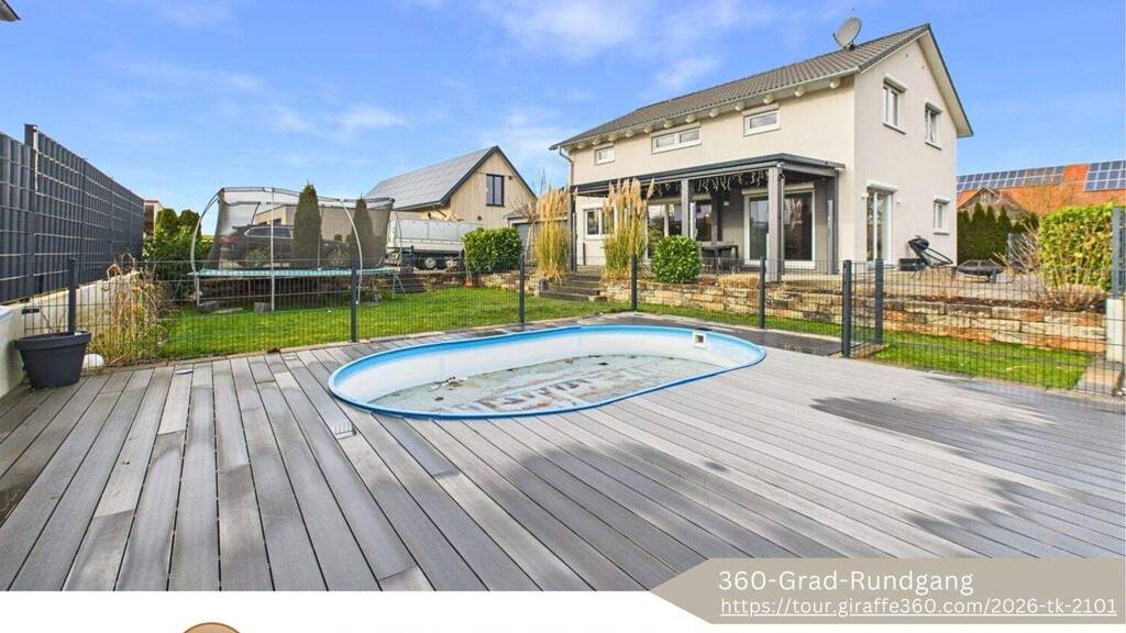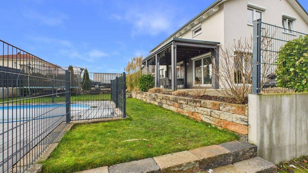 Ein absolutes Highlight ist der großzügige Außenbereich: Die große, überdachte Terrasse lädt zu entspannten Stunden im Freien ein - ob beim Frühstück in der Morgensonne oder beim geselligen Abend mit Familie und Freunden. Der Pool im Garten verwandelt das Grundstück in eine private Wohlfühloase und macht Urlaub im eigenen Zuhause möglich. Eine Regenwasserzisterne ergänzt das nachhaltige Gesamtkonzept und unterstützt die umweltbewusste Gartenbewässerung.