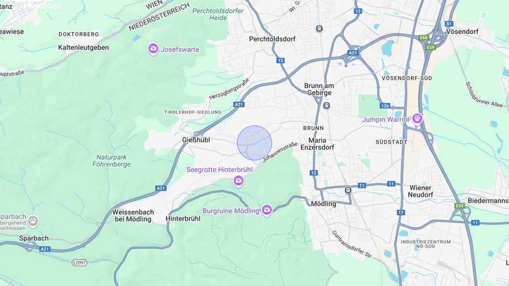 Mit dem Auto erreicht man in 1 Minute die Hinterbrühl, in 3 Minuten die Altstadt von Mödling sowie diverse Nahversorgungsmöglichkeiten und in 5-6 Minuten den Bahnhof Mödling. In etwa 5 Gehminuten erreicht man auch eine Busstation der Linie 11 nach Mödling. Die A21, A1 und die SCS sind in wenigen Minuten mit dem Auto erreichbar.