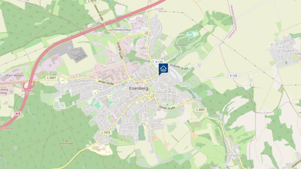 Eisenberg liegt im Osten Thüringens, im Saale-Holzland-Kreis, eingebettet in eine sanft hügelige, waldreiche Landschaft. Die Stadt befindet sich zwischen dem Thüringer Holzland und dem Elstertal und profitiert sowohl von ihrer naturnahen Umgebung als auch von ihrer ausgezeichneten verkehrlichen Anbindung: Die A?9 (Berlin-München) verläuft direkt westlich der Stadt und kann in unter 5 Minuten über kurze Zubringer erreicht werden. Dadurch ist Eisenberg bestens an größere Städte wie Jena (ca. 25?km westlich), Gera (ca. 20?km östlich) und sogar Leipzig (ca. 50?km nördlich) angebunden - ideal für Pendler. Die B7 verbindet die Stadt zudem direkt mit dem Hermsdorfer Kreuz und der A?4, womit auch Erfurt, Dresden und überregionale Ziele schnell erreichbar sind
