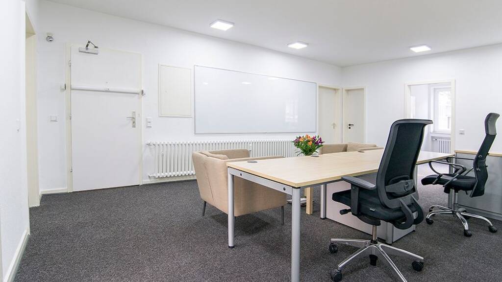 Tische und Bestuhlung (Schreibtisch + 1-2 Stühle) Whiteboard oder Flipchart (je nach Raum)
