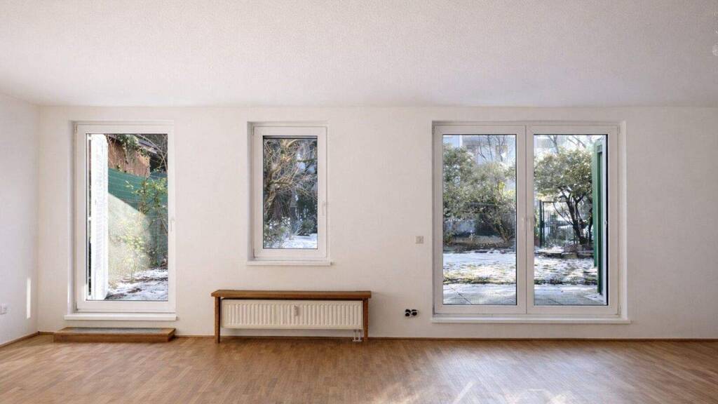 Sämtliche Räume der Wohnung sind zentral begehbar sowie zum ruhigen, südseitig ausgerichteten Garten in Richtung Kupelwiesergasse orientiert. An den Eigengarten schließt ein gepflegter Gemeinschaftsgarten mit kleinem Kinderspielplatz an.