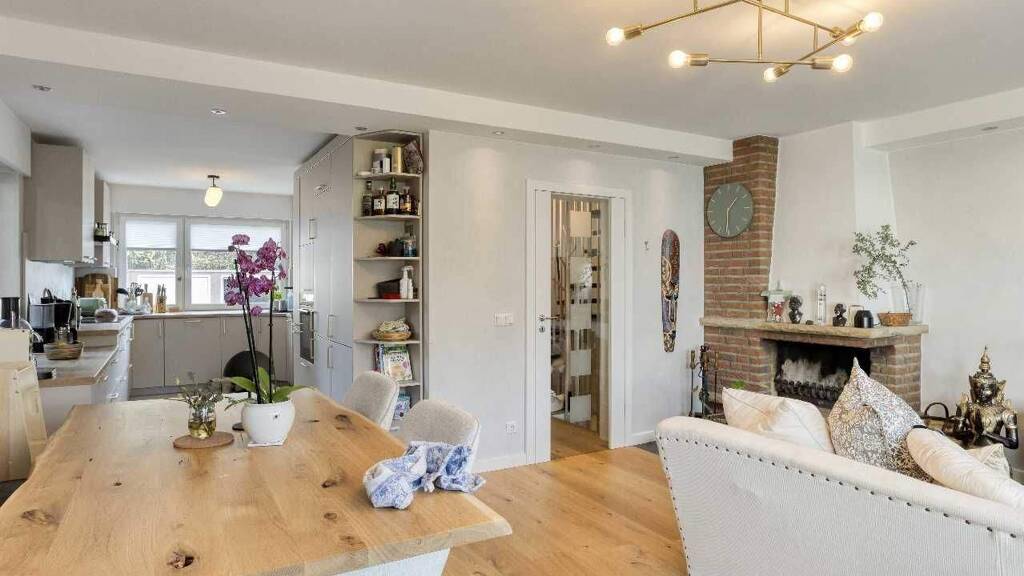 Das Erdgeschoss bildet mit seinem großzügigen Wohn- und Essbereich mit offenem Kamin sowie der angrenzenden, ebenfalls offenen Küche den zentralen Lebensmittelpunkt. Von hier aus besteht ein direkter Zugang zur überdachten Terrasse und in den liebevoll gestalteten Garten. Ein Gäste-WC ergänzt diese Ebene.