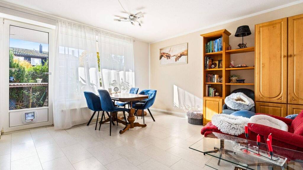 . Flur mit hellen Fliesen, Abgang zum Souterrainbereich, Spanndecke mit eingebauten Spots . Wohn-/Esszimmer, Vinylfußboden in Fliesenoptik, Zugang zur Terrasse . Küche, Einbauküche (2016), Vinylfußboden . Schlafzimmer, Laminat . Duschbad, schwarz gefliest, mit großer Dusche aus 2013, Waschmaschinenanschluss . Hobbyraum innerhalb der Wohnung, Fenster und Heizung, Laminatfußboden . überdachte Terrasse mit Süd-Ausrichtung und kleinem Garten