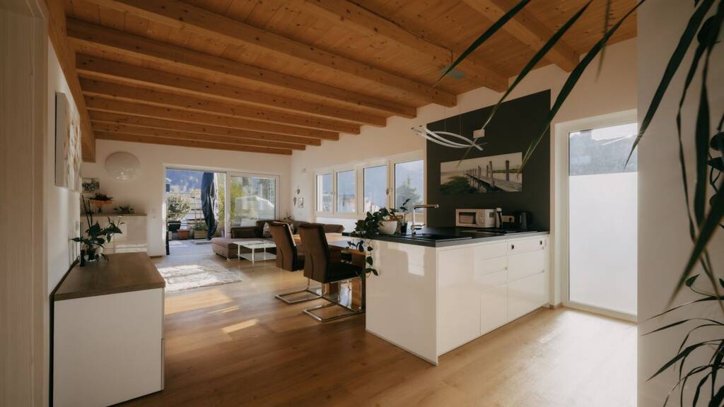 Das Obergeschoss besticht durch ein modernes Wohnkonzept, das Eleganz und Funktionalität vereint. Über einen separaten Treppenaufgang gelangen Sie in diesen exklusiven Bereich, der durch einen offenen Wohn- und Essbereich mit hochwertiger Einbauküche glänzt. Der Raum bietet Platz für gemeinsame Abende und lädt gleichzeitig zu ruhigen Momenten ein.