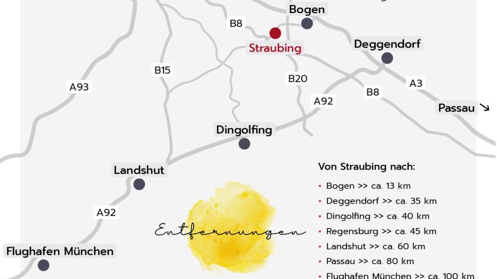 Straubing selbst verbindet historischen Charme mit modernem Stadtleben. Die idyllische Lage an der Donau, eine lebendige Kulturszene und regelmäßige Veranstaltungen wie das Gäubodenvolksfest machen die Stadt besonders lebenswert. Als wirtschaftliches Zentrum Niederbayerns bietet sie eine starke Infrastruktur mit zahlreichen Arbeitsplätzen. Die Verkehrsanbindung ist hervorragend: Mit dem gut erreichbaren Bahnhof, Anbindungen an die B20 und A3 sowie schnellen Verbindungen nach Regensburg und München ist die Stadt auch für Pendler attraktiv. Diese Kombination aus urbanem Komfort und naturnaher Erholung macht Straubing zu einem idealen Wohnort.