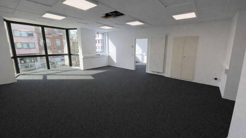 Das Highlight der Fläche ist nicht etwa der gute Zuschnitt der Räume oder die Lage im Zentrum, das Highlight ist der Erker mit einer großen bodentiefen Fensterfront mit Blick auf den Neuwieder Luisenplatz. Neben viel Tageslicht zum Arbeiten können hier z.B. auch sehr repräsentativ Kunden empfangen und beraten.