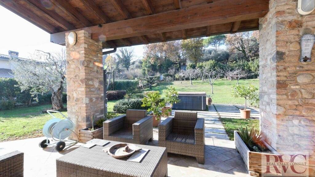 Im wunderschönen gepflegten Garten befindet sich eine Veranda mit Küche und Pizzaofen und schließlich ein Whirlpool.