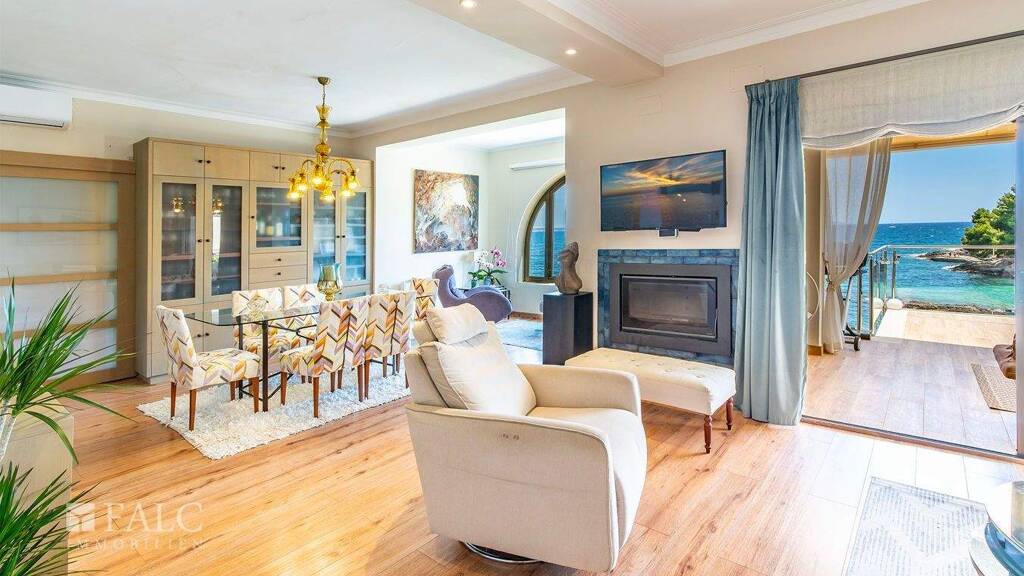 Auf einer bebauten Fläche von ca. 155 m² verteilen sich die Räumlichkeiten großzügig. Vom hellen Wohn-/Essbereich mit Kamin gelangt man auf eine Terrasse, die mit einem fantastischen Blick auf die vorgelagerte Badebucht und das offene Meer begeistert. Die separate Küche ist komplett ausgestattet und bietet viel Stauraum.
