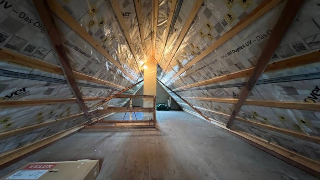 Zurück im Flurbereich führt eine massive Betontreppe in das Dachgeschoss, wo alle Fenster sowie die Balkontür ca. im Jahre 2006 erneuert wurden. Grundsätzlich ist hier für eine zweite Wohneinheit alles gegeben. Hier stehen zwei weitere Zimmer zur Verfügung, welche sich ganz Ihren Ansprüchen anpassen. Eines der Zimmer stellt einen herrlichen, hellen Bereich mit Zugang auf den Balkon dar. Das zweite Zimmer ist quadratisch geschnitten und die leichte Dachschräge wird optimal mit einem weiteren Einbauschrank genutzt. Zusätzlich ist hier eine zweite Einbauküche vorhanden, welche rückgebaut als sechstes Zimmer oder ebenso genutzt werden kann. Ein gefliestes Duschbad mit Fenster komplettiert die Räumlichkeiten im Dachgeschoss. Wobei der offene mit einem Dachfenster ausgestattete Flurbereich mit wenigen Handgriffen eine zusätzliche, ideale Verwendung findet. Eine ausziehbare Holzleiter ermöglicht den Zutritt auf den großzügigen Spitzboden mit angenehmer Stehhöhe und entsprechender Dämmung der Geschossdecke. Der Spitzboden ist mit Licht und Fenster versehen und hält weiteren Stauraum bereit. Das mit Pfannen belegte Dach ist innenseitig bereits gedämmt.