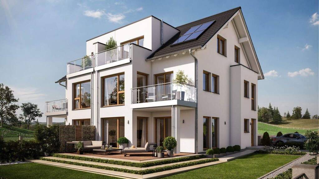 Dass auch auf kleineren Grundstücken große Wohnträume verwirklicht werden können, beweist dieses Doppelhaus. Der Basisbaukörper kommt mit einer Grundfläche von gerade einmal 10 m x 7,40 m aus, bietet im Innern aber eine großzügige Wohnwelt auf drei Ebenen. Für willkommene Platzgewinne sorgen die verschiedenen Architektur-Bauteile: Auf der Eingangsseite schließt sich ein zweigeschossiger Erker mit Flachdach an. Auf der Gartenseite wird das Fertighaus von einem ebenfalls zweigeschossigen Wintergarten-Erker mit Balkon erweitert, über dem ein Zwerchgiebel thront. Sein Flachdach bildet einen spannenden Kontrast zum klassischen Satteldach. In den Winkel zwischen Erker und Haupthaus schmiegt sich ein zweiter Balkon. So hat jede Ebene ihren eigenen Freisitz. Ergänzt wird das Architektur-Konzept von formschönen Fensterpartien, die im Innern ein luftig-leichtes Ambiente schaffen. Betreten wird das Haus über einen Windfang mit angrenzendem Gäste-WC. Über einen offenen Durchgang gelangt man in einen Flur, der zu den weitläufigen Gemeinschaftsräumen führt. Sehr praktisch: Die Küche besitzt einen eigenen Zugang zum Flur. Dadurch lassen sich Wochenendeinkäufe auf direktem Weg zu den Küchenschränken bringen. Als funktionaler Raumteiler und gleichzeitig als Blickfang könnte eine moderne Kochinsel mit Theke fungieren. Der Freiraum vor den bodentiefen Fenstern ist wie geschaffen für einen langen Esstisch, der nicht nur zum gemeinsamen Essen, sondern auch zu geselligen Spieleabenden einlädt. Der Wintergarten-Erker bietet sich für einen Relaxsessel an, von dem man den Blick über die Terrasse und den angrenzenden Garten schweifen lassen kann. Komplettiert wird das Raumprogramm auf der unteren Ebene durch eine kleine Abstellkammer und einen Technikraum. Eine Etage höher befindet sich das Reich der Kinder. Die drei Schlafzimmer eröffnen einen großen Gestaltungsfreiraum: Für jedes Alter lässt sich die passende Wohlfühlumgebung schaffen. Ein Bad mit Wanne und Dusche macht das Wohnglück perfekt. Das Dachgeschoss ist den Eltern vorbehalten. Die Fläche teilen sich ein helles Schlafzimmer, ein flexibel nutzbares Studio, ein Wellnessbad und ein Arbeitszimmer.