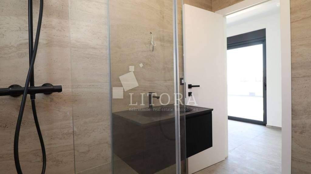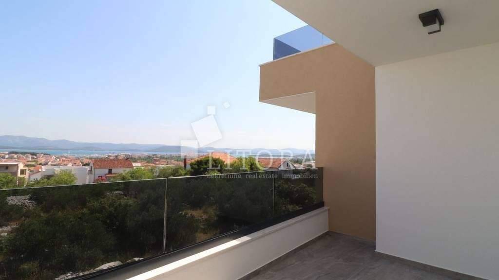 Insel Murter - Neubauapartmant mit über-dachter Terrasse und Meerblick. Neu eingerichtetes Apartment mit einer Nutzfläche von 63,53 m², gelegen im Ober-geschoss eines kleineren Mehrfamilienhauses auf der Insel Murter. Das Apartment ist nach Osten ausgerichtet und bietet einen offenen Blick auf das Meer. Besteht aus einem Vorra-um, einem Badezimmer, zwei Schlafzimmern, einem Wohn- und Essbereich mit Küche sowie einem Ausgang auf eine überdachte Terrasse von 9,76m². Das Apartment ist sofort bezugsfertig und ausgestattet mit Sicherhei-tstüren, Klimaanlagen in allen Räumen, elek-trischen Rollläden und Insektenschutzgittern. Die Entfernung zum Strand Luke beträgt 780 m, und das Ortszentrum ist 850 m entfernt. Zur Wohnung gehört ein Außenstellplatz.