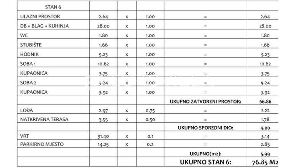 U predivnom malenom mjestu Sv. Petar na Moru gradi se moderni stambeni objekt s 9 stambenih jedinica na udaljenosti od plaze od 180 m.Dvoetazni stan S6 koji se nalazi u prizemlju i na prvom katu objekta povrsine 70,86 m2, sastoji se od prostranog dnevnog prostora povrsine 28 m2 (kuhinja, blagovaonica i dnevni boravak), dvije spavace sobe povrsina 10 m2 i 9 m2, dvije kupaonice, lode i natkrivene terase.Stanu pripada vrt povrsine 31 m2 i vanjsko parkirno mjesto.Stan ce biti opremljen klima uredajima u spavacim sobama i dnevnom prostoru. U kupaonicama ce biti postavljeno podno grijanje a podne obloge ce biti od laminat parketa ili keramickih plocica. Stakla su troslojna a vanjska izolacija je od 10 cm stiropora.Ukupna obracunska povrsina stana je 76,85 m2.Objekt je orijentacije jug.Predvideni zavrsetak radova i useljenje je do kraja 2027 godine.Malo o lokaciji: mjesto Sveti Petar na Moru je dio opcine Sveti Filip i Jakov i udaljen je 20 km jugoistocno od grada Zadra i svega 8 km sjeverozapadno od starog kraljevskog grada Biograd na Moru.U neposrednoj blizini nalaze se prekrasne plaze a u akvatoriju mjesta se nalazi nekoliko malih otocica zbog cega je ovo mjesto zahvalno za ljubitelje brodskih izleta.Na podrucju opcine Sveti Filip i Jakov poznati su vrijedni arheoloski nalazi i sakralni spomenici, te karakteristicni autenticni lokaliteti. Cjelokupno podrucje opcine predstavlja izuzetnu arheolosku cjelinu pa je pozeljna destinacija za sve ljubitelje istrazivanja prirode i bogate proslosti.Dodatne informacije - udaljenosti od vaznijih lokacija:More: 180 m / Plaza: 180 m / Zadar 20 km / Zracna luka 15 kmKupovina: 100 m / restoran: 100 m / ljekarna 5 km / centar mjesta 200 mZa sva dodatna pitanja stojim na raspolaganju.... Vise na eurovilla.hr, ID: 777478