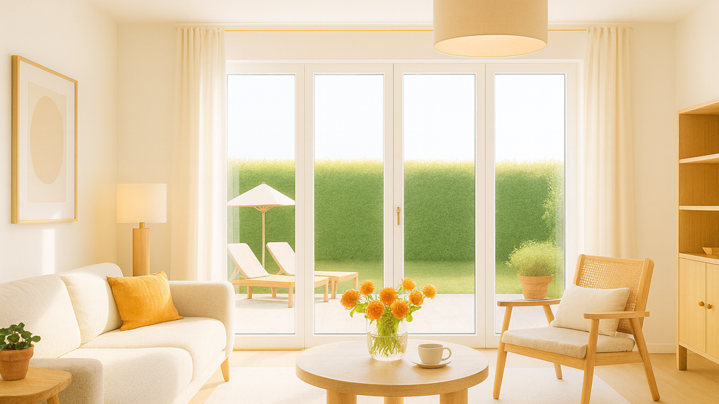 Die Erdgeschosswohnung öffnet sich mit einem lichtdurchfluteten Wohnbereich und bodentiefen Fenstern, die direkt auf die Terrasse und den kleinen Garten führen.
