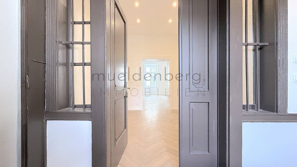 Besonders hervorzuheben sind die beeindruckenden Flügeltüren, die den Wohnbereich elegant voneinander abgrenzen und für eine offene, luftige Atmosphäre sorgen. Diese Details verleihen der Wohnung einen charmanten Charakter und unterstreichen den besonderen Stil dieser Immobilie.