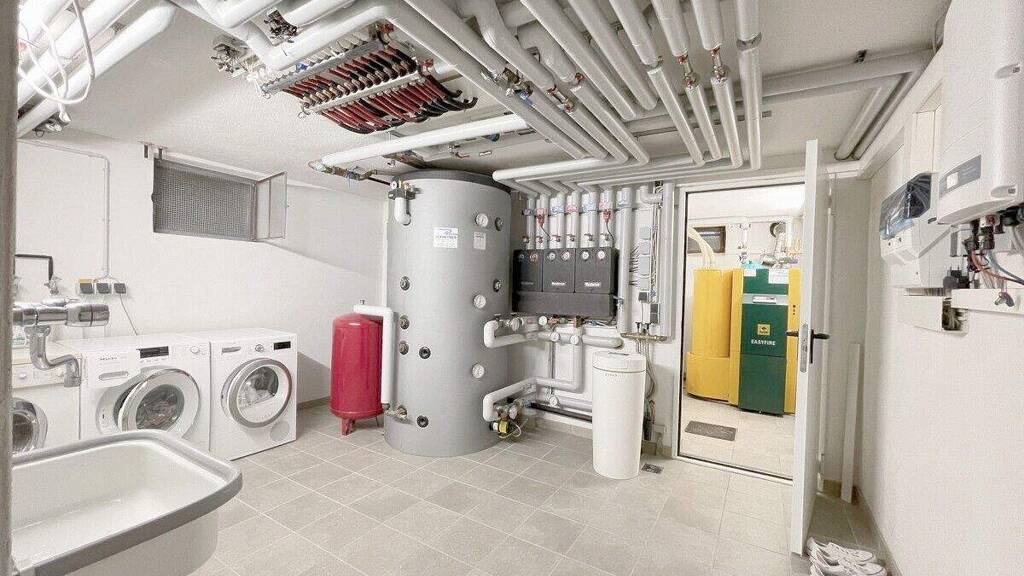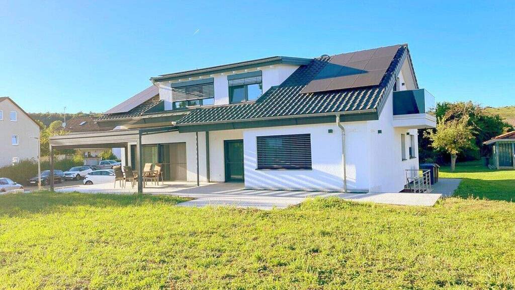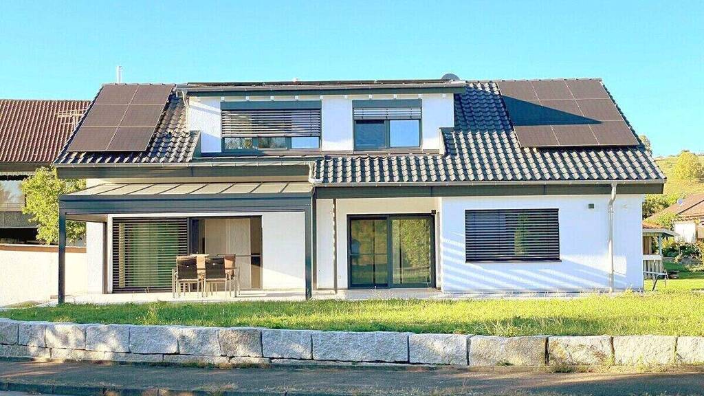 Das Haus wurde aus einem Haus aus den 1970'er Jahren entwickelt, allerdings ist davon nichts mehr zu sehen, denn es wurde komplett und von Grund auf zurückgebaut und dann kernsaniert und wieder neu aufgebaut. Somit ist bis auf das Mauerwerk, was rundum dick gedämmt wurde mit einem Vollwärmeschutz, alles neu, insbesondere auch das gesamte Dach inkl. der Dämmung und der Gauben, die gesamte Haus- und Leitungs-Technik und Installationen und natürlich alle Fenster und alle Ausstattung wie Bäder, Böden, Türen, etc.. Das Haus ist somit jetzt einem Neubau vergleichbar und alles befindet sich in einem Erstbezugszustand. Das Haus besitzt außerdem und unter anderem: - Batteriespeicher Varta Element 6 mit 5,9 kWh - Solarmodule Photovoltaik LG9,43 kWp - Rollläden elektrisch gesteuert - Holz-Alu-Fenster Fa. Gugelfuss und Kneer mit elektrischen Kontakten für Heizungssteuerung - Fußbodenheizung in allen Räumen außer Vorratsraum mit mehreren Heizzonen je Raum - Türe Bad EG rollstuhlgerecht 1m mit begehbarer Dusche - in jedem Wohnraum mind. 2 Netzwerkdosen - in jedem Wohnraum mind. 2 Antennendosen - an allen vier Ecken des Hauses Videoüberwachung vorgesehen - Pellett-Heizung - 1000 Liter Pufferspeicher mit zusätzlichem elektrischen Heizstab von Photovoltaik-Anlage gesteuert - Terrasse teilweise elektrisch überdachbar, verschattbar (horizontal, vertikal) - Verteilerschrank für Netzwerk und Fernsehen - Lampen (Einbaustrahler LED) dimmbar - Gebäudeautomatisierung mit KNX (Bus-System) - Doppelgarage (noch bauzeitlich) mit Kraftstrom (auch für Ladestation geeignet) - zusätzlicher Stellplatz für Auto vorgesehen - Bad OG mit bodengleicher Walk-In-Dusche und vorgesehen für zusätzliche freistehende Badewanne - Kontrollierte Wohnraumlüftungsanlage LTM vorgesehen - Gartenbeleuchtung an mehreren Stellen Leitungen vorgesehen - Mähroboter Ladestation vorgesehen - Schalterausführung Jung KNX - Einbauküchen im EG von Schüller und im OG von Nobilia für insgesamt zusätzlich 30.000 Euro erhältlich