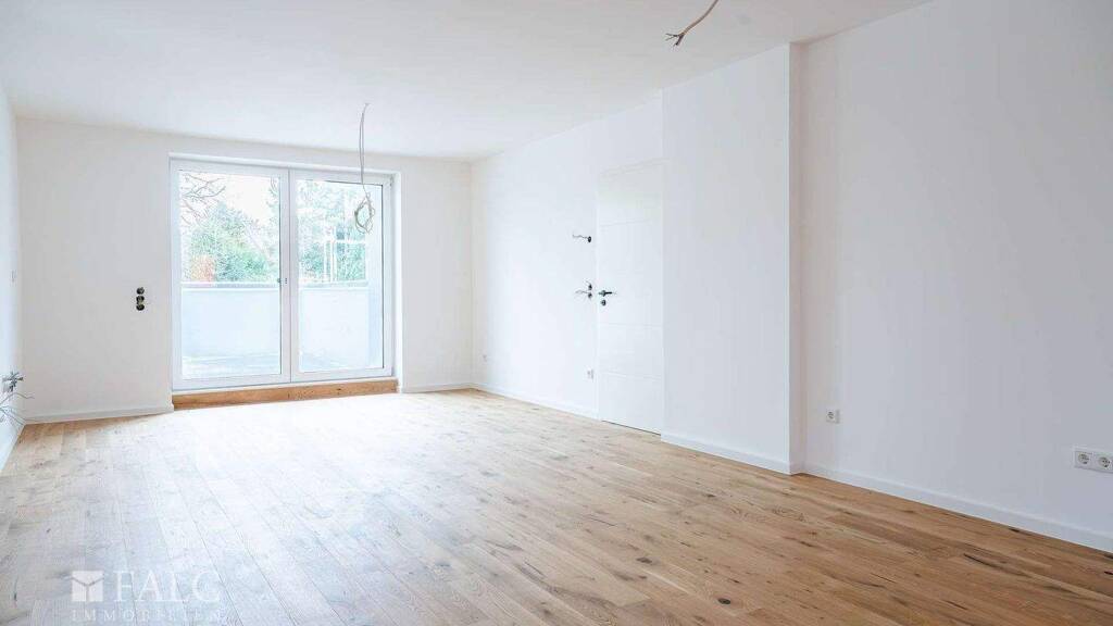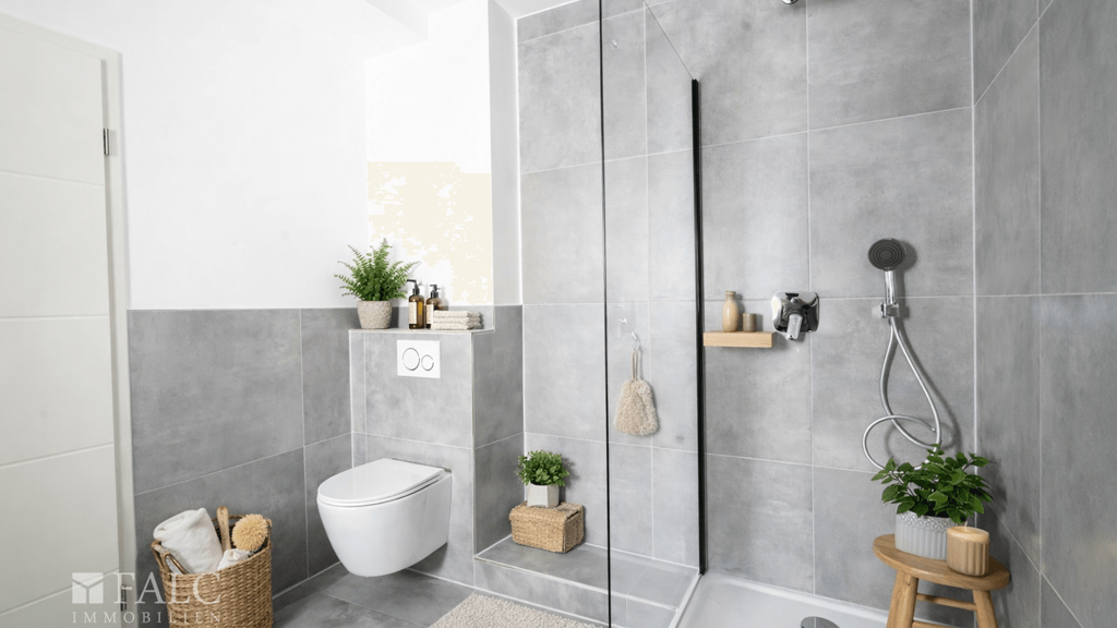 Das Badezimmer ist elegant ausgestattet mit großformatigen 60×60 cm Fliesen und einer bodentiefen Dusche, ergänzt durch hochwertige Materialien sowie eine durchdachte Lichtplanung mit LED-Spots. Der Waschmaschinenanschluss befindet sich ebenfalls im Badezimmer und sorgt so für zusätzlichen Wohnkomfort.