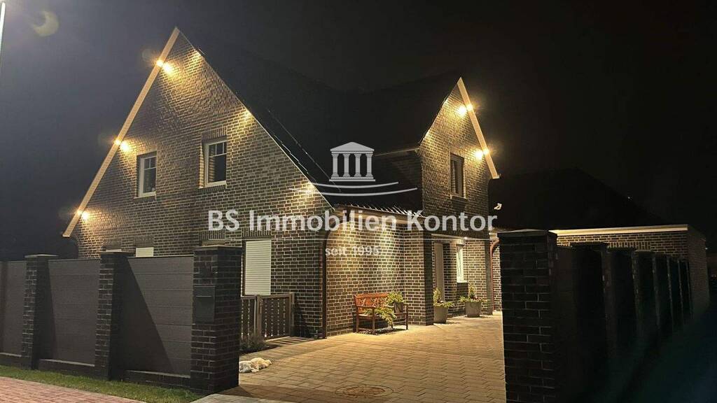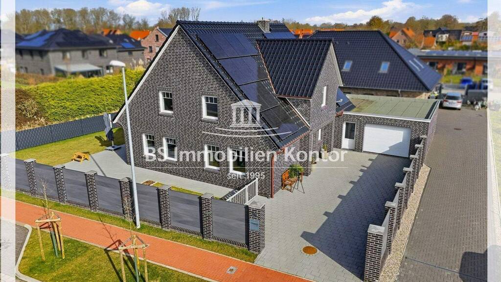 Dieses moderne und energieeffiziente Einfamilienhaus in ruhiger und zugleich zentraler Wohnlage von Hage überzeugt durch seine hochwertige Bauausführung, eine durchdachte Raumgestaltung sowie eine gehobene Ausstattung. Das im Jahr 2023 errichtete Wohnhaus präsentiert sich in einem neuwertigen Zustand und bietet mit einer Wohn- und Nutzfläche von ca. 181 m² ein komfortables Zuhause für anspruchsvolle Käufer. Helle, großzügig geschnittene Räume sowie eine offene Gestaltung schaffen eine angenehme Wohnatmosphäre und ein modernes Wohngefühl. Der offen konzipierte Wohn-und Essbereich mit hochwertiger Küche und Kochinsel bildet das Herzstück des Hauses und lädt zum gemeinsamen Verweilen ein. Große Fensterelemente sorgen für viel Tageslicht und schaffen eine harmonische Verbindung zwischen Innen- und Außenbereich. Die Immobilie verfügt über mehrere Schlafzimmer sowie zwei exklusive Badezimmer, die durch ihre hochwertige Ausstattung und zeitlose Gestaltung überzeugen. Dank der durchdachten Raumaufteilung ist zudem ebenerdiges Wohnen möglich, wodurch sich das Haus auch langfristig flexibel nutzen lässt. Das ca. 663 m² große Grundstück istpflegeleicht angelegt und vollständig eingefriedet. Eine hochwertige Zaunanlage mit gemauerten Pfeilern unterstreicht den gehobenen Charakter der Immobilie. Der Außenbereich bietet ausreichend Platz zum Entspannen sowie zur individuellen Gestaltung. Eine großzügige Garage mit zusätzlichem Abstellraum sowie mehrere PKW-Stellplätze sorgen für ausreichend Platz und Komfort im Alltag. Besonders hervorzuheben ist die moderne Energietechnik: Eine Photovoltaikanlage sowie die energieeffiziente Bauweise tragen zu niedrigen laufenden Kosten bei und sorgen für ein nachhaltiges Wohnkonzept. Die Lage in Hage verbindet ruhiges Wohnen mit einer guten Infrastruktur. Einkaufsmöglichkeiten, Freizeitangebote, medizinische Versorgung sowie Schulen und Kindergärten sind in kurzer Zeit erreichbar und machen diesen Standort besonders attraktiv.