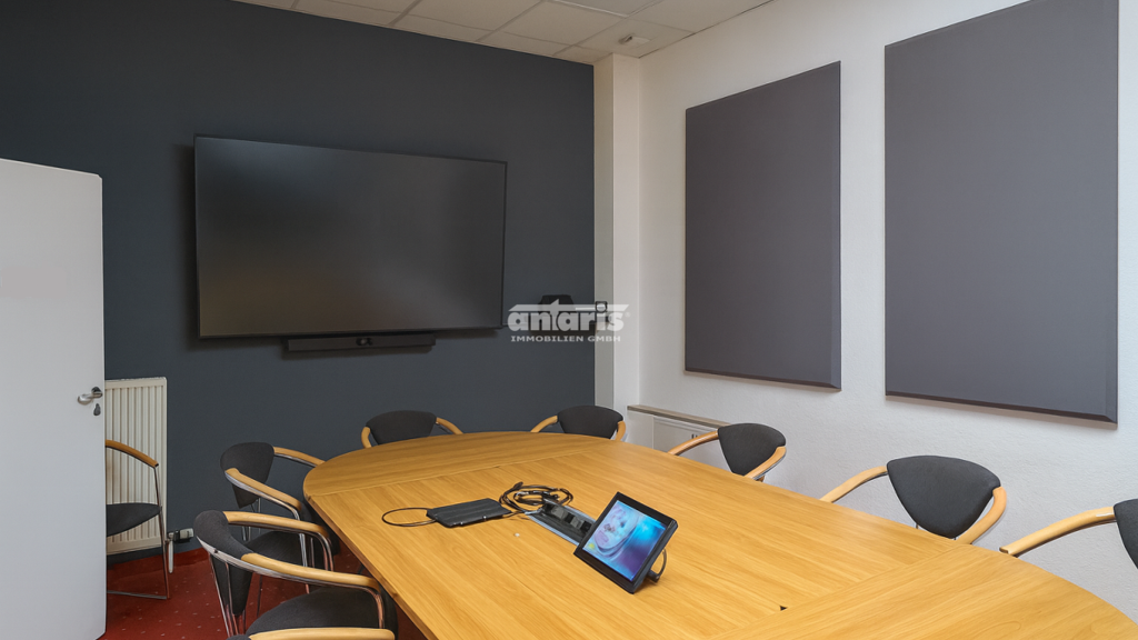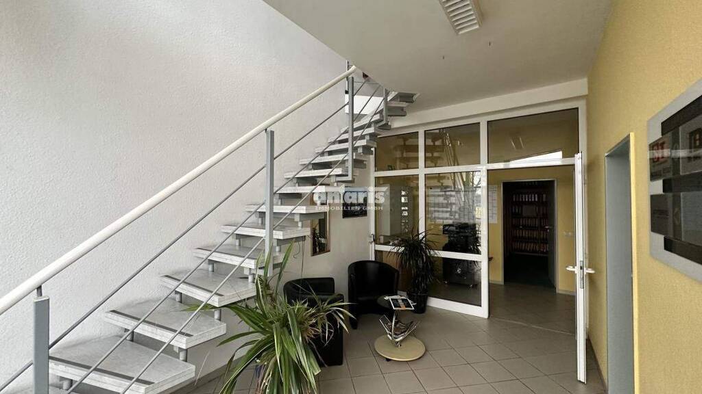 Über eine interne Treppe gelangt man in das Obergeschoss, das weitere Büroräume für Büro- oder Verwaltungsaufgaben bietet. Die Aufteilung unterstützt eine klare Trennung von Arbeitsbereichen und sorgt für eine nachvollziehbare Struktur.
