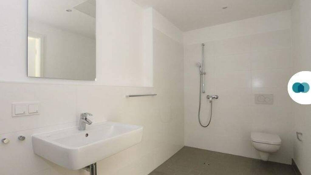 Das Badezimmer beeindruckt mit seinen modernen, grauen Bodenfliesen und vermittelt eine zeitlose Eleganz. Ausgestattet mit einer Fußbodenheizung, einer stilvollen Walk-In-Dusche, einem WC und einem Waschbecken, wird jeder Aufenthalt zu einem wahren Wellness-Erlebnis.