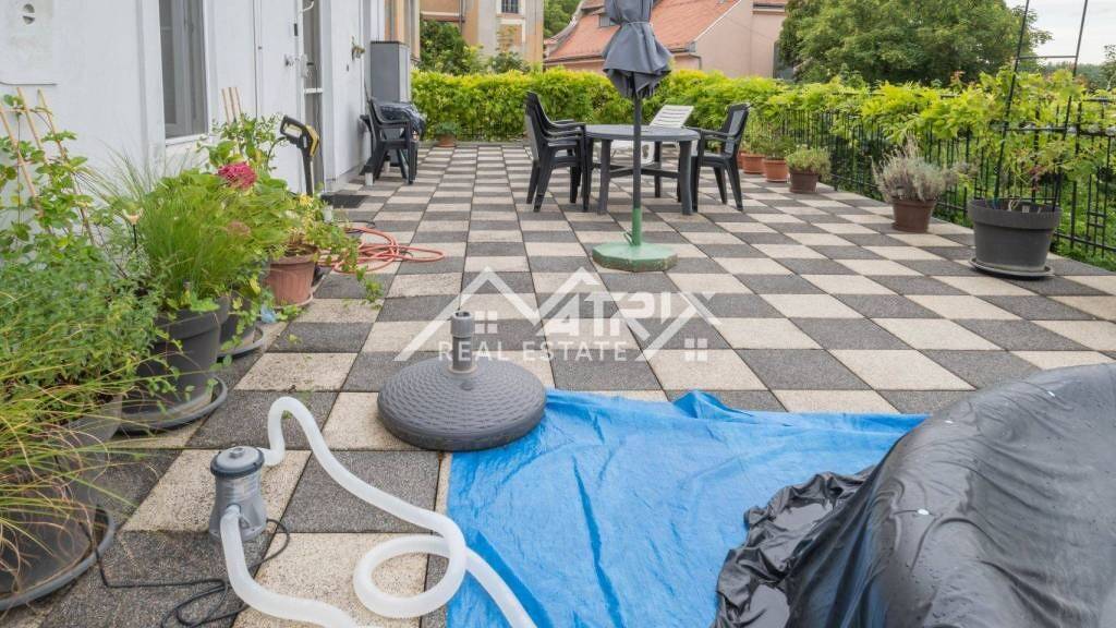 Ein besonderes Highlight dieser Immobilie ist die große Terrasse von etwa 100 m², von der sich ein offener Blick über Baumkronen und Dächer der Stadt bietet. Solch ein Außenbereich ist im Stadtzentrum äußerst selten und bietet ideale Möglichkeiten für Erholung und Aufenthalt im Freien.