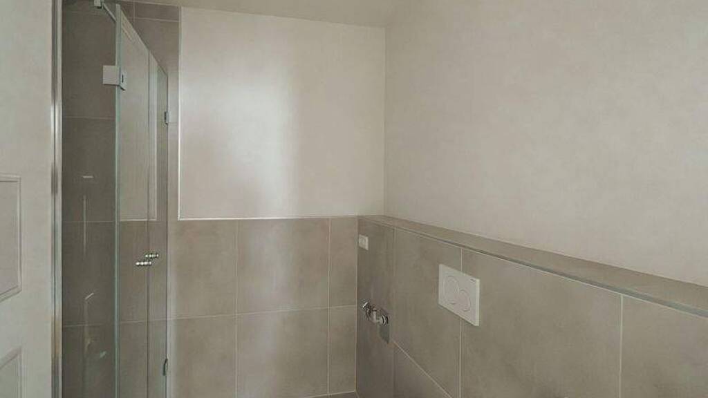 Das Badezimmer präsentiert sich in einem modernen, zeitlosen Grau und überzeugt mit hochwertigen Materialien. So erwartet Sie beispielsweise eine bodentiefe Dusche mit Glastüren.
