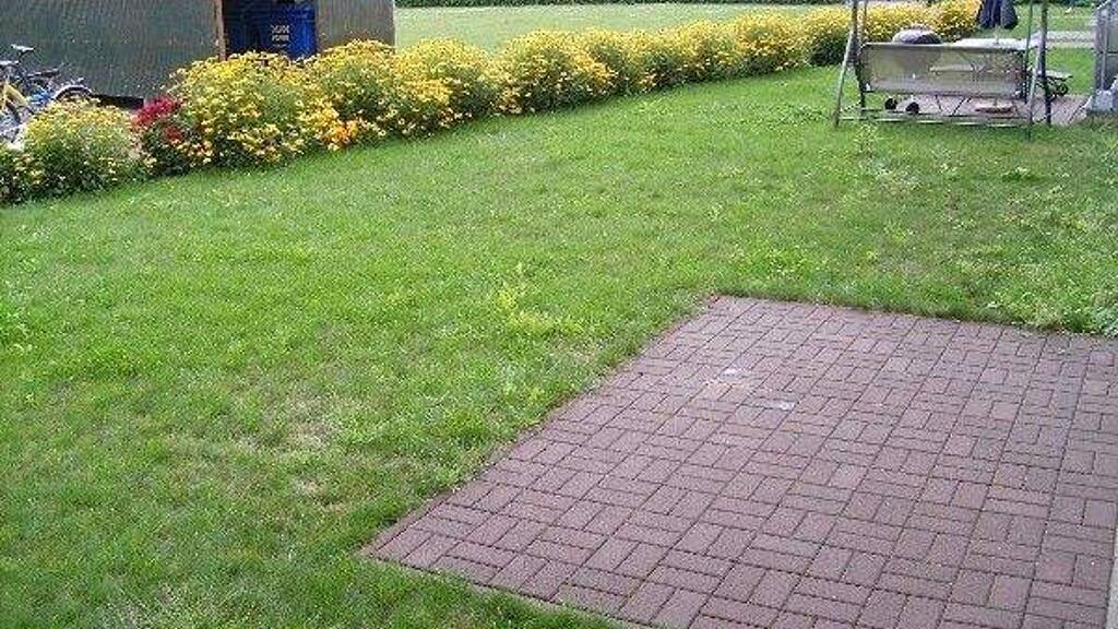 Der ebenfalls ruhige gemeinsame Hofbereich der komplett eingezäunten Wohnanlage, zu der dieses Haus gehört, ist als gepflegte neu angelegte große Grünanlage mit gepflasterten Wegen gestaltet. Dort befinden sich u. a. auch ein Wäschetrockenplatz mit mehreren Wäschetrockenspinnen sowie übersichtliche Spielgeräte für Kinder.