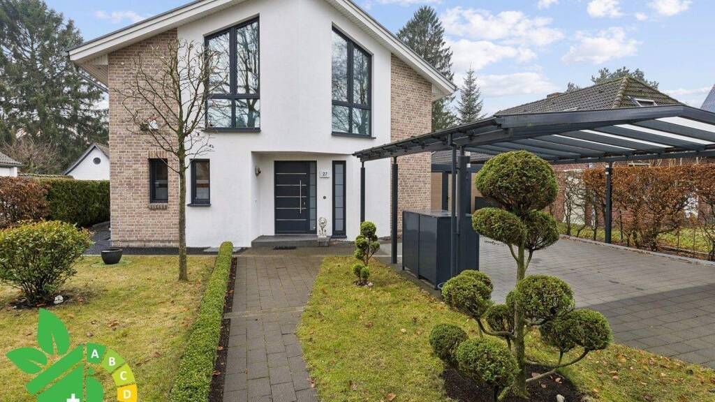 Errichtet wurde die Villa als KfW-Effizienzhaus in ca. 2015, gelegen an einer ruhigen Seitenstraße. Sie präsentiert sich auf einem ca. 1.018 m² großen, süd-westlich ausgerichteten Grundstück. Über die großzügige Diele erreichen Sie die im Parterre liegenden Räume. Der helle Wohn-/Essbereich ist mit hochwertigem Echtholz-Parkett ausgelegt und bildet mit der offenen, in den Raum integrierten Küche das kommunikative Zentrum des Hauses. Die luxuriöse Küche ist hell, zeitlos und modern gehalten. Aus dem Wohnbereich öffnen bodentiefe Fenster den Blick auf die angrenzende Terrasse und den elegant angelegten Garten. Ein schiefersteingefliestes Gäste-WC vervollständigt das Erdgeschoss. Die Deckenhöhe der gesamten Etage beträgt ca. 2,60 m.