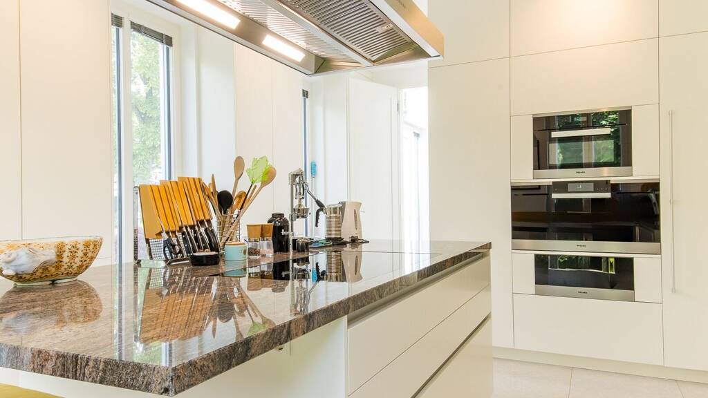 Das Erdgeschoss ist dem Wohnen gewidmet, bereits beim Eingang beeindruckt das bis unter das gläsererne Dach offene Foyer, der über 60 m² große mittig angeordnete Wohnbereich mit Ausgang auf die Gartenterrasse sowie anschließendem großem Speisezimmer auf der Westseite sowie Kaminbereich auf der Ostseite. Die zeitlos gestaltete Küche ist mit edlem Natursteinoberflächen und hochwertigen Miele-Geräten ausgestattet.