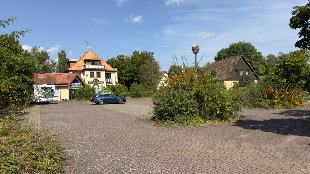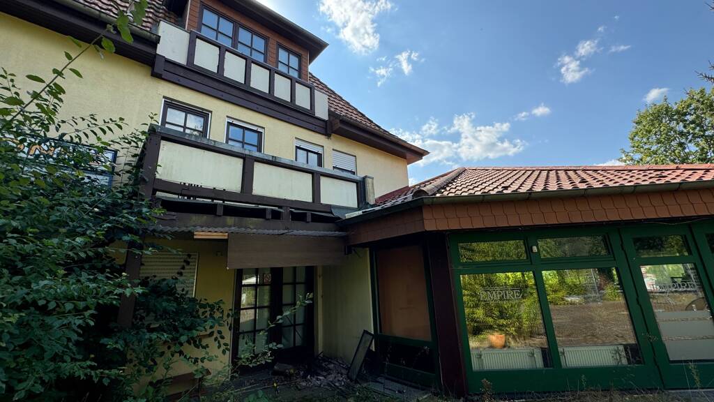 Bei der zum Verkauf stehenden Liegenschaft handelt es sich um ein 2.736 m² großes Grundstück, welches mit einem Geschäftshaus nebst Anbau bebaut ist. Das Geschäftshaus (Hauptgebäude) wurde zuletzt im Keller und Erdgeschoss gastronomisch betrieben, Ober- und Dachgeschoss wurden als Pensionszimmer genutzt. Der Anbau diente hier als Tanzbar mit entsprechenden WC-Räumen im Kellergeschoss.