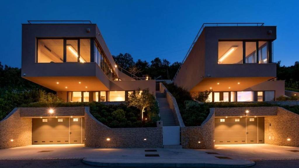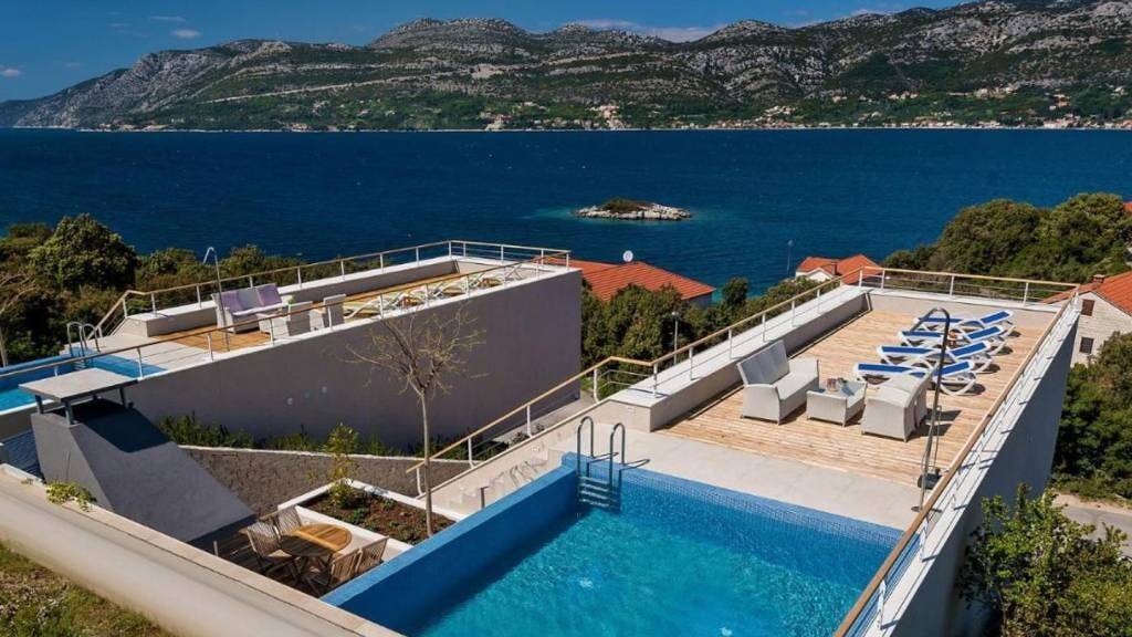 Zwei exklusive Neubauvillen mit Meerblick stehen zum Verkauf. Sie befinden sich in einer kleinen Küstenstadt auf der Insel Korcula, nur 50 Meter vom kristallklaren Meer und einem wunderschönen Kiesstrand entfernt. Jede Villa hat vier Stockwerke, die durch eine Kombination aus internen und externen Steintreppen verbunden sind. Im Erdgeschoss gibt es Fitness, Wellness mit Sauna und Fitnessraum. Auf der gleichen Etage befindet sich auch eine Garage. Der erste Stock kann über eine Treppe, die durch die Garage führt, oder über eine Außentreppe erreicht werden. Diese Etage ist mit drei geräumigen Schlafzimmern und zwei großen Badezimmern ausgestattet. Jedes Zimmer hat durch Glaswände Zugang zu einer offenen Terrasse mit einer Massagewanne im Freien und einem wunderbaren Blick auf das Meer. Auf der zweiten Etage befindet sich ein offenes Wohnzimmer mit viel Tageslicht, eine Küche und ein Esszimmer. Das Wohnzimmer öffnet sich zur Terrasse, auf der Sie sich entspannen können, von wo aus Sie einen herrlichen Blick auf das Meer, die Umgebung und den Sonnenuntergang genießen können. Die letzte Etage umfasst eine Dachterrasse mit beheiztem Infinity-Pool und Grill. Auf der Dachterrasse gibt es mehrere kleinere Grünflächen, die dazu beitragen, eine besondere Atmosphäre zu schaffen, während Sie den Panoramablick genießen. Die Villen sind von einer Steinmauer umgeben und von Grünpflanzen umgeben. Die Villen bieten gleichzeitig kompletten Luxus und Privatsphäre mit vielen verschiedenen inbegriffenen Einrichtungen. Während des Baus wurden nur die hochwertigsten Materialien und Spitzentechnologie verwendet, während der Innenraum geschmackvoll mit neuen modernen Möbeln mit einem Hauch von Eleganz eingerichtet ist.