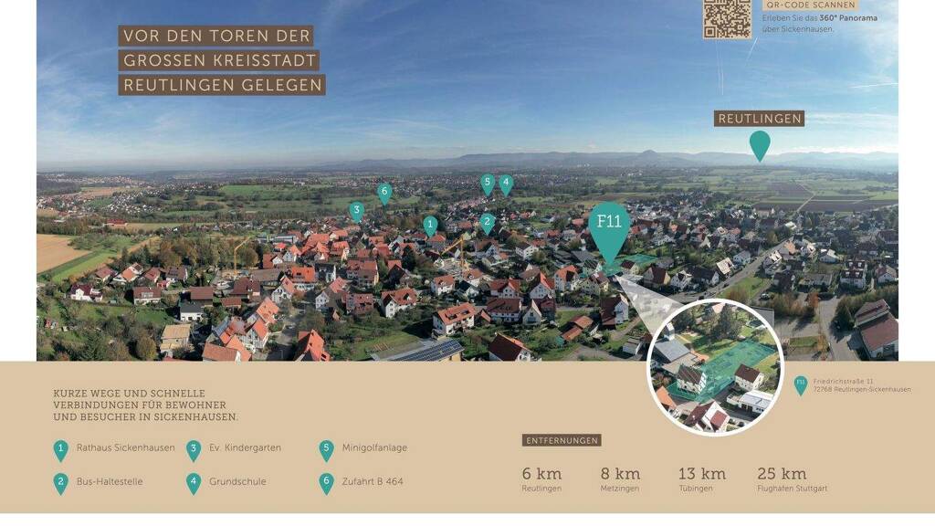 Sickenhausen ist einer von insgesamt zwölf Stadtteilen der großen Kreisstadt Reutlingen. Die Stadt liegt rund fünf Kilometer von der Reutlinger Innenstadt entfernt. Am nordwestlichen Stadtrand von Reutlingen gelegen punktet Sicken- hausen vor allem bei der Infrastruktur. Durch die Anbindung der Bundesstraße sind die umliegenden Stadtteile sowie Reutlingen, Tübingen und auch der Stuttgarter Flughafen schnell und ein- fach mit dem Pkw erreichbar. Den ländlichen Flair und die kurzen und schnellen Wege wissen die ca. 2.100 Einwohner besonders zu schätzen.